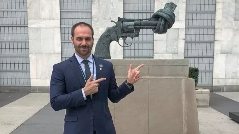 Eduardo Bolsonaro faz um gesto afrontoso ao símbolo internacional de combate à violência e a favor do desarmamento. Note que a peça atrás do troglodita, que se encontra na entrada da ONU, é de um revólver com um nó no cano. Das duas uma: ou o Bananinha quis fazer um insulto ao símbolo da paz ou não entendeu bulhufas do que a escultura significa.